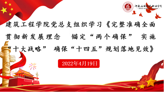 2022年4月19日,建筑工程学院党总支组织全体教师在办公楼516党员活动室学习《完整准确全面贯彻新发展理念 锚定“两个确保” 实施“十大战略” 确保“十四五”规划落地见效》,本次学习采用线上、线下相结合形式进行,旨在贯彻河南省第十一次党代会精神,学习河南省高质量发展战略布局,会议由学院党总支书记马春燕主持。