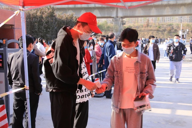 考试期间,考生佩戴口罩,在入校大门处进行体温检测,依据个人绿色健康码有序排队入校。从进校到考场,沿途多出设立提示牌,志愿服务引导员随处可见。从考生进校门、现场信息确认、考生进考场大楼到进考场,整个考区各项工作井然有序、有条不紊进行。