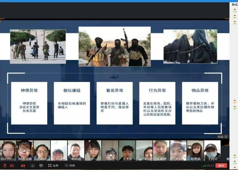 各班级班会通过线上形式学习《中华人民共和国反恐怖主义法》相关知识、观看反恐安全知识视频。并通过国际上的恐怖袭击案例来为同学们讲解了恐怖暴力的手段表现、反恐防暴相关法律法规、反恐防暴应对措施以及受伤后的自救方法等内容。各班级辅导员围绕班会主题,给同学们讲解了公民安全防范常识,如何对暴力恐怖犯罪线索进行举报等反恐怖常识,及一些应对暴力恐怖袭击的原则和应对策略。针对同学们的实际情况,共同总结与分析面对紧急事件的方法,重点强调了如遇到砍杀袭击、纵火、爆炸、枪击、劫持等暴力袭击事件时,应第一时间报警并寻找安全位置,不围观、不靠近,并一定要保护好自己;如遇可疑人跟随,一定要避免走无人的小巷,并迅速到就近的派出所报警。