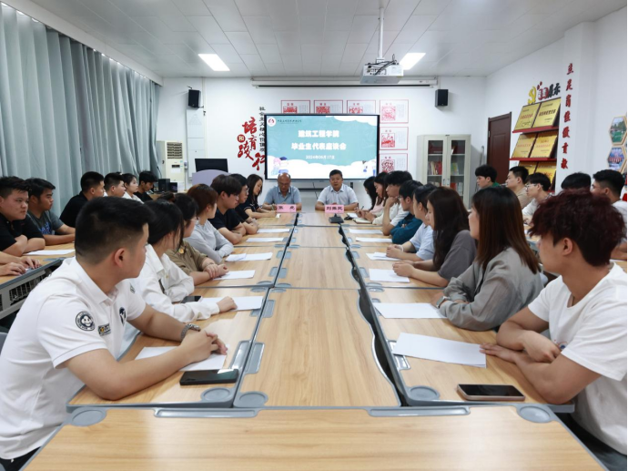 2024年6月17日下午,建筑工程学院2024届毕业生座谈会在行政楼A516会议室召开。副校长刘振民出席座谈会,学院党总支书记张虎、党总支副书记刘亚娟、党政办主任李慧杰、辅导员张慧和2024届毕业生代表参加了本次座谈会,会议由党总支书记张虎主持。